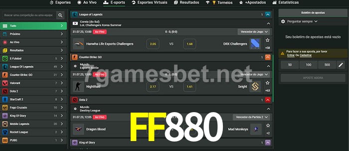 O FF880 oferece uma grande seleção de opções de apostas em e-sports com probabilidades competitivas